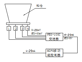 MIPS儀表將來自FBX-100C毫伏變送器的標準電流信號進行I/V變換,A/D轉換轉成數字量,而后去皮重,按預置的數學模型和有關參數計算出料倉中物料的重量。一方面在面板上顯示出來,另一方面以標準的4~20mA電流信號將此料倉的噸位傳給DCS(或其它種類的上位機)。